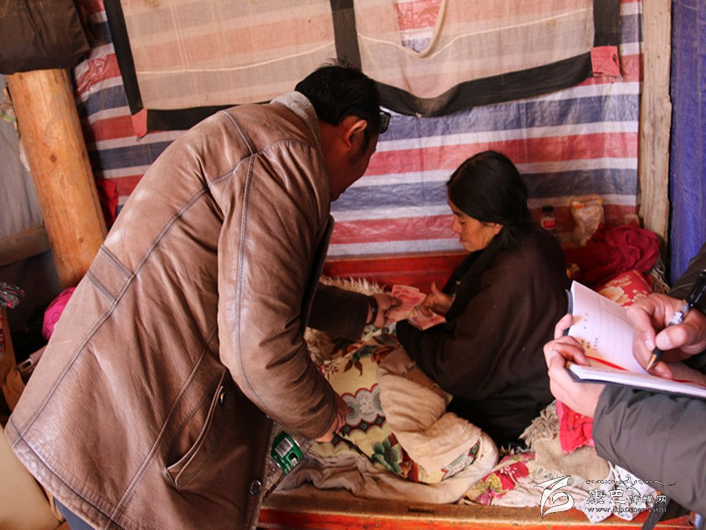 圖為孫曉牧將捐款送到益西則瑪手中。(唐書偉 陳雪峰 攝影報道)