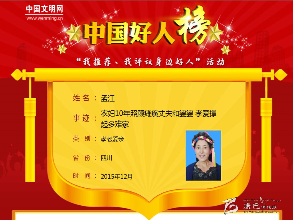 本網(wǎng)訊(丹巴縣委宣傳部)近日,從中央文明辦主辦、中國(guó)文明網(wǎng)承辦的“我推薦、我評(píng)議身邊好人”活動(dòng)中傳來(lái)喜訊,最美媳婦孟江10年照顧癱瘓丈夫和公婆,孝愛(ài)撐起多難家入選“中國(guó)好人榜”。