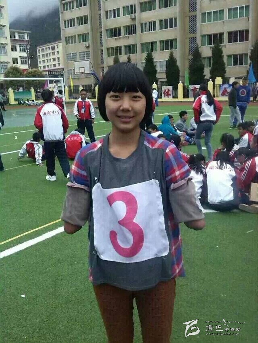 在康定中學(xué)校園里,你會邂逅這樣一位女孩:臉上永遠燦爛著陽光般的微笑,雙眼永遠閃爍著自信樂觀的光芒。教室里,她聚精會神地聽課;圖書館里,她專心致志地讀書;操場上,她身輕如燕地奔跑;寢室里,她開心爽朗地和同學(xué)交流。可你仔細一看,她竟然沒有雙臂,就像折翼的天使。她就是該校高2016屆8班學(xué)生,羌族女孩許方燕。行走在高原的風(fēng)中,她是一幀讓每一個人內(nèi)心泛起感動漣漪的美麗風(fēng)景……