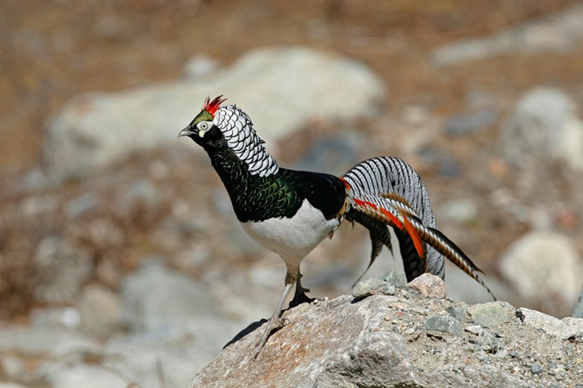 白腹錦雞(學(xué)名:Chrysolophus amherstiae):藏語譯音:甲嚇破呷妞仁 別名:銅雞、寬寬雞 國家II級保護(hù)動物,見于瀘定、康定、丹巴、九龍等。 雄鳥全長約140厘米,雌鳥約60厘米。雄鳥頭頂、背、胸為金屬翠綠色;羽冠紫紅色;后頸披肩羽白色,具黑色羽緣;下背棕色,腰轉(zhuǎn)朱紅色。飛羽暗褐色。尾羽長,有黑白相間的云狀斑紋。腹部白色。嘴和腳藍(lán)灰色。雌鳥上體及尾大部棕?