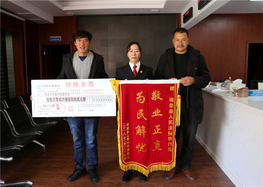 在執(zhí)行款發(fā)放現(xiàn)場,得榮法院執(zhí)行局局長小娜錯(cuò)法官正逐一核對當(dāng)事人信息,辦理領(lǐng)款手續(xù),她向筆者介紹說:“去年開始,我們在共擬定出了29個(gè)基本解決執(zhí)行難的工作任務(wù),形成了7條具體措施,對所屬的11件執(zhí)行難案每件形成專項(xiàng)行動(dòng)方案,并將‘一案一辦法’的基本原則落實(shí)到了后續(xù)的23件案件執(zhí)行當(dāng)中,取得了良好的執(zhí)行效果,今后我們將持續(xù)深入執(zhí)行難專項(xiàng)行動(dòng),全面深入落實(shí)依法治理,切實(shí)保護(hù)人民群眾的合法權(quán)益,努力讓人民群眾在每一件司法案件中都感受到公平正義,感受到更多的幸福感和安全感?!?/p>
