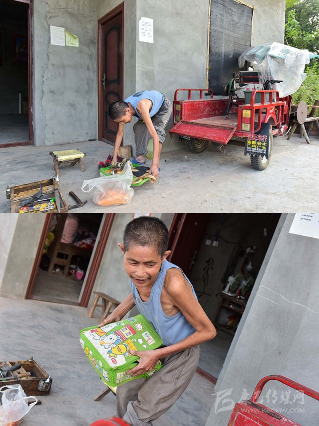 “周強善曾是全鄉(xiāng)最困難的貧困戶?!敝行泥l(xiāng)黨委書記楊壘說,周強善的妻子在剛生下女兒后因病去世。2005年,他在外務工時右腿受傷,留下殘疾。后來他自學補鞋技術,成了一名鞋匠,但腿腳不便、下山路不通,三娃多年“悶”在家里。