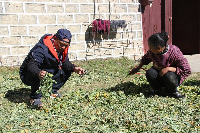 郭林幫助村民格絨卓瑪翻曬蘿布葉。