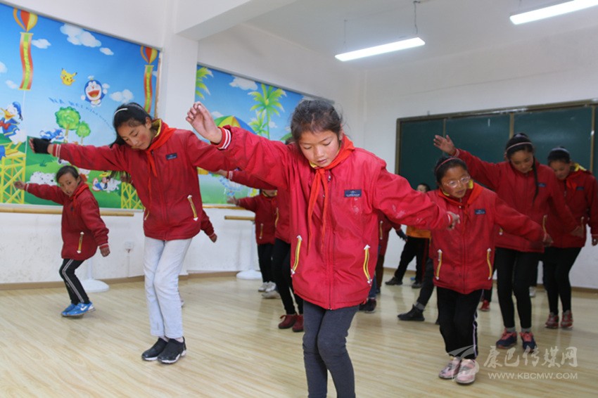 “要跟隨節(jié)拍,注意動(dòng)作協(xié)調(diào)連貫,舞蹈是非常愉悅的享受,要面帶微笑,動(dòng)作不要太僵硬?!痹谖璧甘遥蠋熣托牡丶m正孩子們的舞蹈動(dòng)作。老師是縣文化館的專業(yè)演員,成為學(xué)校的舞蹈老師后,她就負(fù)責(zé)全校的舞蹈教學(xué)工作。