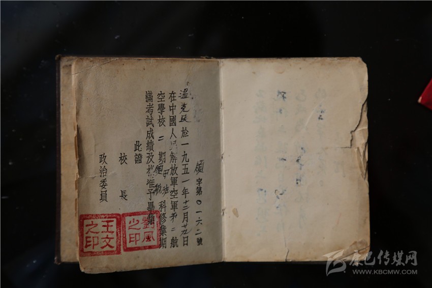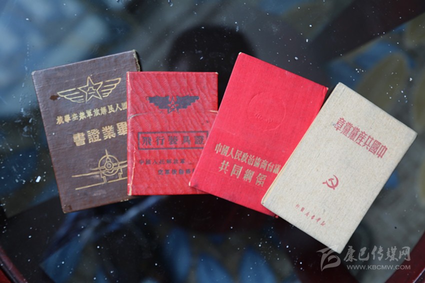 溫克棟的大兒子、57歲的溫樹平拿出大伯留下的遺物——一本中國人民解放軍航空學(xué)校畢業(yè)證書、一本中國人民解放軍空軍后勤部發(fā)的飛行裝具證、一本《中國共產(chǎn)黨黨章》、一本《中國人民政治協(xié)商會議共同綱領(lǐng)》,四本珍貴的文物書頁發(fā)黃,有的還有些微殘缺,但卻是珍貴的歷史見證物,溫家視為傳家寶。