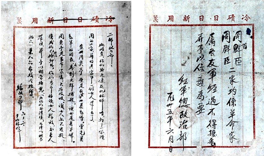 1935年6月2日,劉伯承同志寫給2師政治部的信。周奕庭是劉伯承順、瀘起義部隊(duì)的團(tuán)長(zhǎng),起義失敗后轉(zhuǎn)入地下,1932年在成都被捕后遇害。紅2師先頭部隊(duì)抵達(dá)化林坪時(shí)錯(cuò)將其家屬當(dāng)作 “土豪”,抓走其弟媳。劉伯承同志為此給2師政治部寫信,說(shuō)明其家為革命烈屬。其弟媳很快得到釋放,其家屬也得到了保護(hù)。