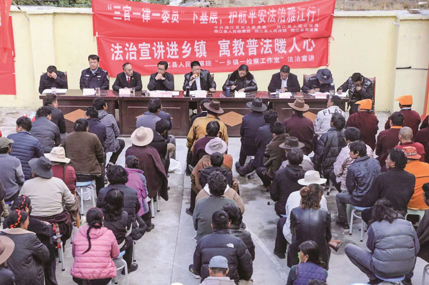 “三官一律一委員”通過高效整合法官、檢察官、警官、律師、政法委員五支力量,緊緊圍繞“155533”市域社會(huì)治理總體發(fā)展思路,以“五治融合”為目標(biāo),通過“縣級(jí)+鄉(xiāng)鎮(zhèn)”的人員配置、“政策+法律”的職能作用、“法條+案例”的豐富內(nèi)容、“宣講+提問”的互動(dòng)方式,將單一的宣講工作變?yōu)槎嘣恼勑恼勗?,形成新的“五位一體”工作方法,并致力于化解“五大風(fēng)險(xiǎn)”,強(qiáng)化“五大建設(shè)”,同時(shí)鞏固市域社會(huì)治理現(xiàn)代化工作成果,探索構(gòu)建合縱之環(huán)、合縱之勢(shì)、合縱之力,為建設(shè)更高水平的平安雅江、法治雅江提供了更加堅(jiān)實(shí)的法治保障。
