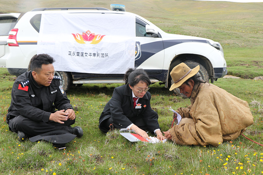 在草地上、田野里設(shè)置巡回法庭是“正義雪蓮”女子審判團(tuán)隊(duì)常見(jiàn)的開(kāi)庭形式。這樣的方式不僅方便群眾,就近辦案、減輕訴累,也大大提高了法院的辦案效率。在團(tuán)隊(duì)里,一些本土女法官熟悉地方文化習(xí)俗,精通當(dāng)?shù)胤窖裕齻冊(cè)谵k案中也常常巧妙借用一些好的傳統(tǒng)習(xí)俗解決矛盾糾紛,使司法不僅有剛性的定紛止?fàn)?,也有柔性的溫暖守護(hù),她們像雪蓮一樣維護(hù)高原江南的公平正義。