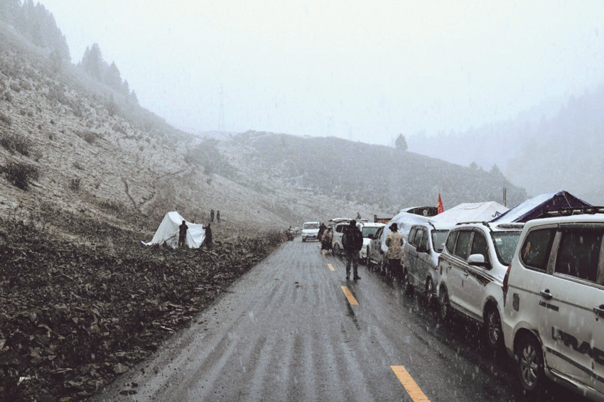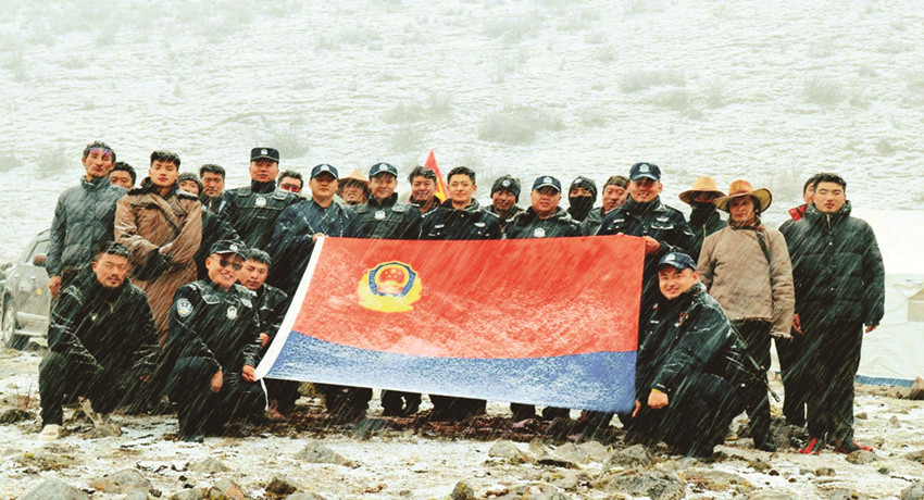 然而,高原的天、娃娃的臉,說變就變。剛剛還艷陽高照的晴好天氣,瞬間寒風(fēng)四起,鵝毛大雪不一會(huì)便覆蓋了整個(gè)山野。由于到達(dá)蟲草采集點(diǎn)還需4、50分鐘人力轉(zhuǎn)運(yùn)物資,受天氣影響,前行受阻,擔(dān)任護(hù)送任務(wù)的民輔警當(dāng)即幫助群眾搭建臨時(shí)安置點(diǎn),風(fēng)雪中警民互助的身影像極了一家人。一切收拾停當(dāng),盡管風(fēng)寒雪大,條件艱辛,樂觀的群眾和伴隨服務(wù)的民輔警還不忘在風(fēng)雪中來一張合照,他們說,這是歷年來的慣例,每次上山采集蟲草和下山返程,他們都會(huì)一個(gè)不少地拍張“全家?!?,以此留念蟲草季警民相依的美好記憶。