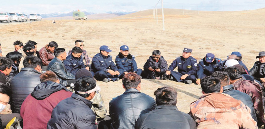 稍作休整,為了讓蟲草采集群眾和隨行的數(shù)十臺(tái)各型車輛安全到達(dá)魯然蟲草山,派出所民輔警和鄉(xiāng)鎮(zhèn)工作人員組織群眾席地而坐召開壩壩會(huì),核查入山證,講明道路交通安全、森林草原防火知識(shí),提醒群眾遵紀(jì)守法、文明進(jìn)山。