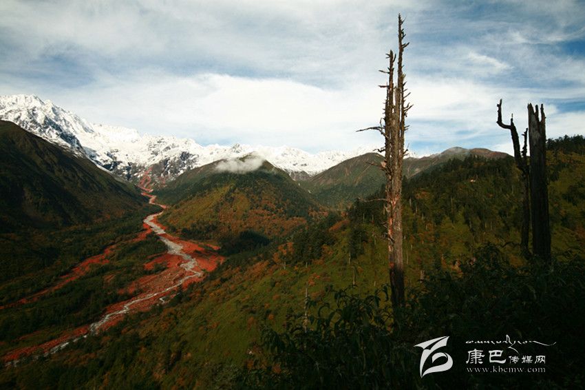 總起來說,紅石灘是這樣一壁畫屏:兩黛山之間,為一大溝;大溝飛流直下,紅石如瀑增多,至平地,紅石成片,如水瀉地;在兩黛山及大溝的背后,為一壁雪山,冰清玉潔,十分醒目。