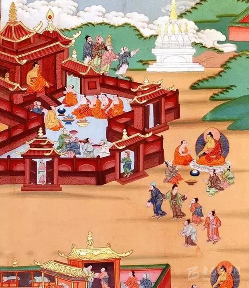 曬佛節(jié)時,寺院內(nèi)依墻懸掛一幅幅精美畫卷。這些畫用純天然顏料及金粉、銀粉繪制。畫中人物形象生動,山川、花卉烏獸和諧、線條流暢、章法嚴謹、色澤艷麗、栩栩如生。這套保存至今的《如意寶藤》唐卡畫,共三十一幅(現(xiàn)只有:9幅,另外兩幅文革期間失蹤), 至今猶如新著色的一般。其中, 由郎卡杰描繪的米拉日巴講經(jīng)圖,在只有幾平方毫米的空間中畫出了巖洞內(nèi)米拉日巴在講經(jīng),以及洞外獵犬和鹿聽經(jīng)等生動形象,其姿態(tài)美麗、線條清楚、色彩明亮,達到了傳神的藝術(shù)感染力,人們稱他是“巧奪天工之神”。據(jù)藏畫人員介紹,該畫在作色、筆畫等風格方面是模仿漢地的技法,風景、建筑物以及佛身上的裝飾品畫得非常逼真,這種畫法至今仍然在甘孜縣部分地方流行。
