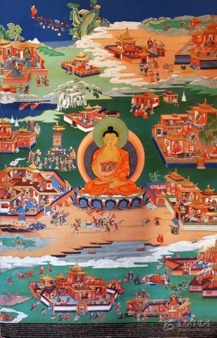 這套《如意寶藤》唐卡畫是在十七世紀,東谷寺第六世活佛降巴更登嘉措命畫師郎卡杰繪制而成。傳說在十七世紀,在今爐霍縣境內(nèi)的一個地方,有戶農(nóng)民家生了一名聰明伶俐的小男孩,因其家境貧困從小就當童工,為別人放牧維持生活,其乳名為孜珠(牧童)。孜珠非常喜歡繪畫,平常利用放牧的空閑學(xué)畫,沒有紙張筆墨,晴天里他把地當紙,用小棍做筆, 陰天用石板作紙,小石子作筆每天堅持學(xué)習繪畫。他在極其艱苦的環(huán)境中,勤學(xué)好問,刻苦鉆研繪畫知識及其基本技巧。他刻苦學(xué)畫的恒心和誠意,感動了神仙畫師毗首羯摩。在一個良辰吉日神仙畫師來到人間收孜珠為徒,把自己的所有知識傳授于他。