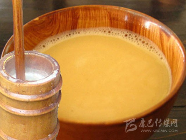 酥油茶是藏族群眾每日必備的飲品。是西藏高原生活的必需。寒冷的時(shí)候可以驅(qū)寒;吃肉的時(shí)候可以去膩;饑餓的時(shí)候可以充饑;困乏的時(shí)候可以解乏;瞌睡的時(shí)候,還可以清醒頭腦。藏民們?nèi)粘V谱魉钟筒钑r(shí)一般使用磚茶,需要時(shí)用刀切削一小塊備用。然后在鍋中加300毫升水煮沸,加3到5克碎磚茶,煮到茶水變黑熄火。茶水變色后,可加入0.5克鹽。如果天氣寒冷的話還可以多加一些鹽。最后,再加入2克酥油(約湯匙的三分之二)。飲用時(shí)將酥油茶經(jīng)過濾網(wǎng)注入茶壺中再倒進(jìn)小茶杯飲用。