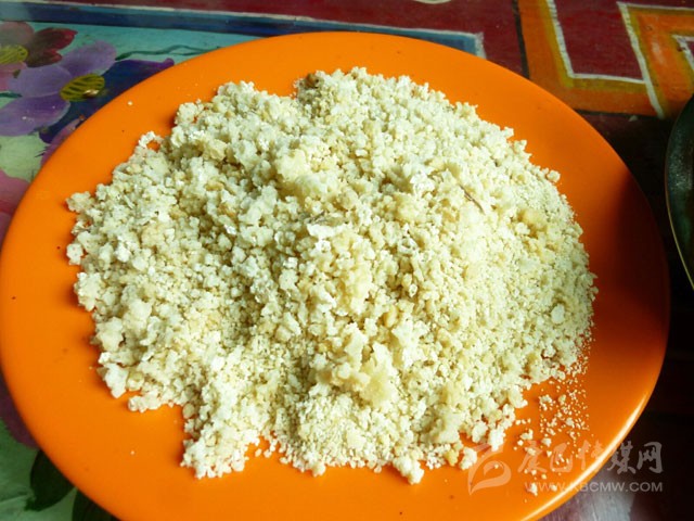 奶渣是奶提煉酥油后剩下的物質(zhì),經(jīng)燒煮,水份蒸發(fā)后,剩下是奶渣,奶渣可以做成奶餅、奶塊。在煮牛奶過程中,還可揭起奶皮,藏語叫“比瑪”。奶皮就像豆腐皮一樣,好吃又富有營養(yǎng)。奶品是藏族的重要食品,家居或外出,人們都帶上它。在零食品種不多的藏區(qū),大人們常把奶渣給小孩當(dāng)零食。麻森在盤子里放上適量的糌粑、酥油、碎奶渣及碎紅糖,攪混揉合,盛入一方形小木盒內(nèi),用手塞滿、壓實,即可制成麻森方形糕,其味香甜可口。