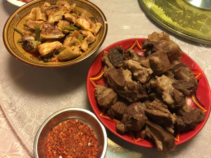 藏族同胞好將牛羊肉大塊入鍋大火煮之,剛過心則撈起。吃時(shí)手抓刀削入口,謂之手抓砣砣內(nèi)。冷熱食皆佳,肉嫩味鮮。現(xiàn)在迎合大眾口味,有些用炒,有些用烤,蘸著海椒面,味道簡直美味極了。