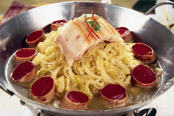 血腸的烹飪方法也別具特色。將灌好的血腸放入湯中煮沸,煮至血腸浮起,腸成灰白色,約八成熟,便立即起鍋,盛入盤內(nèi),全家席地而坐,割而食之。