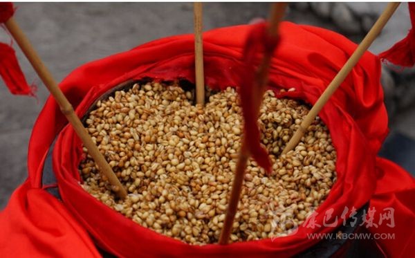 嘉絨語稱“恰鹵”。咂酒是青稞釀制而成的。首先取一定數(shù)量的青稞粒,一般5斤、8斤或10斤,在大鐵鍋中用水煮成八成熟后,放在簸箕里晾開,待冷卻后放上一定比例的酒曲,合勻,又裝入大鐵鍋中發(fā)酵三至四天,待聞到酒香味后,裝入壇中并加水,放置一天以上后,即可取汁食用,這個汁就是咂酒。咂酒味甘甜淳厚,十 分爽口,看似不醉人,但有的甘甜之中略帶苦澀,說明酒勁足,不勝酒力者應(yīng)少飲為宜。曾有人寫《飲咂酒詩》說:“成石雜糧一甕收,王侯到此也低頭,五龍抱住 撐天柱,咂盡黃河水倒流”。充分展示了咂酒的魅力和飲咂酒的那種愜意。境內(nèi)巴底、半扇門的上半鄉(xiāng)、太平橋鄉(xiāng)一帶的群眾喜愛煮咂酒,平日,家家都備有咂酒,親朋間禮尚往來、人情世故都送咂酒。喝咂酒是當(dāng)?shù)氐囊淮罅?xí)俗。《章谷屯志(略)》記載了清朝后期宅壟土屯區(qū)的飲食習(xí)俗時說:“夷人(封建統(tǒng)治者對藏族的貶 稱)寨中置巨甕或木桶,富者大銅瓶盛酒,于內(nèi)植竹竿十余枝,跌坐于地互相吸飲,不杯杓勸酧(酬),無餚核(指熟食的魚肉干果),惟各布豬膘、牛肉、‘得木 鳥’(火燒子饃饃),醉飽而散”。現(xiàn)在,巴底鄉(xiāng)、半扇門的上半鄉(xiāng)、太平橋鄉(xiāng)的大多數(shù)村寨仍然保留著這些習(xí)俗。在節(jié)日或慶典之時,在大壩子中間放一個大的壇子或木桶,里面盛滿含有酒糟的咂酒,然后插入麥桿數(shù)根,眾人圍個大圓圈跳鍋莊,口渴時依次吸之;或一人手持葫蘆,里盛咂酒,在眾人中依次轉(zhuǎn)之;或眾人盤腿 圍坐,傳一壺咂酒,稱喝“轉(zhuǎn)轉(zhuǎn)酒”。