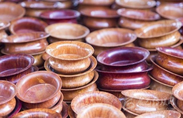 按藏族傳統(tǒng),一般人使用得最多的餐具是木碗。木碗一般用樺木、雜木雕琢而成,質(zhì)地結(jié)實(shí),不易破裂,花紋細(xì)膩,較為美觀。木碗的制作過(guò)程,一是選材,二是風(fēng)干,三是制坯,四是細(xì)磨,五是上色。藏族木碗可分為大碗、小碗、蓋碗、套碗、木缽等多種,用途廣泛,可供喝茶,吃糌粑,存放食品、香料、佐料等,而且還具有光滑、細(xì)致、美觀、適用、不變味、喝茶香、攜帶方便等特點(diǎn)。雜木碗還有防毒的優(yōu)點(diǎn)。至于純金、純銀做成的勺子、筷子、碗和盤,雖然在民間也能見(jiàn)到,但畢竟不是被普遍使用的生活用品,一般給客人奉茶都使用瓷碗。