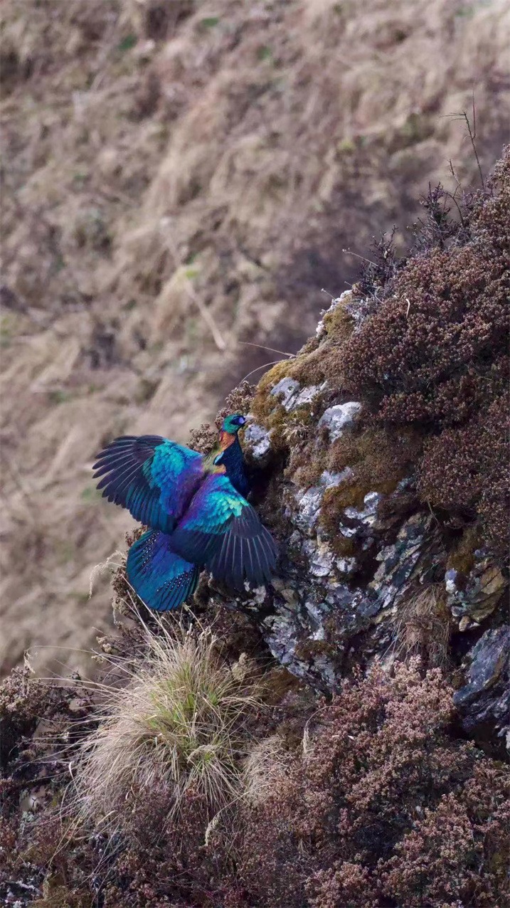 據(jù)了解,綠尾虹雉屬雞形目雉科,羽毛多彩絢麗,有著“蜀山彩虹”的美譽(yù)。綠尾虹雉以植物的嫩葉、花蕾、嫩枝、幼芽和種子等為食,它們棲息于海拔3000米至5000米的針葉林、高山草甸、灌叢和裸巖地帶,每年4-5月繁殖。是我國(guó)的特產(chǎn)種類,分布于四川、云南西北部、西藏東南部、甘肅東南部和青海南部一帶,珍稀程度堪比大熊貓。
