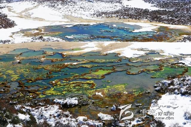 泉華灘位于貢嘎山西坡,為鈣化地貌,灘長900多米,寬100余米,依山而下形成5個(gè)泉華階地。每個(gè)階地上有數(shù)十個(gè)大小不同、形態(tài)各異的五色彩池,池中有羌活魚自在游弋。在泉華灘的頂上有一道趵突泉,不間斷地突然從地底噴發(fā),十分壯觀。
