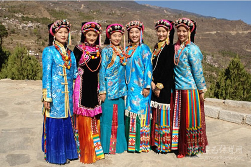 以丹巴縣和康定縣大渡河沿岸為代表。康定魚通區(qū)和雅拉鄉(xiāng)一帶又自有特點。以長方形黑金絲絨底繡花頭帕對折,戴于頭上,額前伸出約數(shù)厘米,腦后下披至后頸,寬至兩鬢,然后用大紅頭繩或五彩頭繩瓣發(fā)盤于帕上,辮子套各式辮飾。外披披風(fēng),一般是條紋白色或原初皮毛披風(fēng),內(nèi)穿錦緞上衣,下著五彩百褶長裙,腰系絲織或綢質(zhì)彩色花腰帶,男戴金絲帽,足穿彩靴為風(fēng)彩。嘉絨地區(qū)服飾還受羌族習(xí)俗的影響,生活俗裝普遍穿長等衫,以藍黑色為主,下身系圍腰,腰扎寬大彩帶,冬天穿羊皮褂或羊毛織成的無領(lǐng)服等。