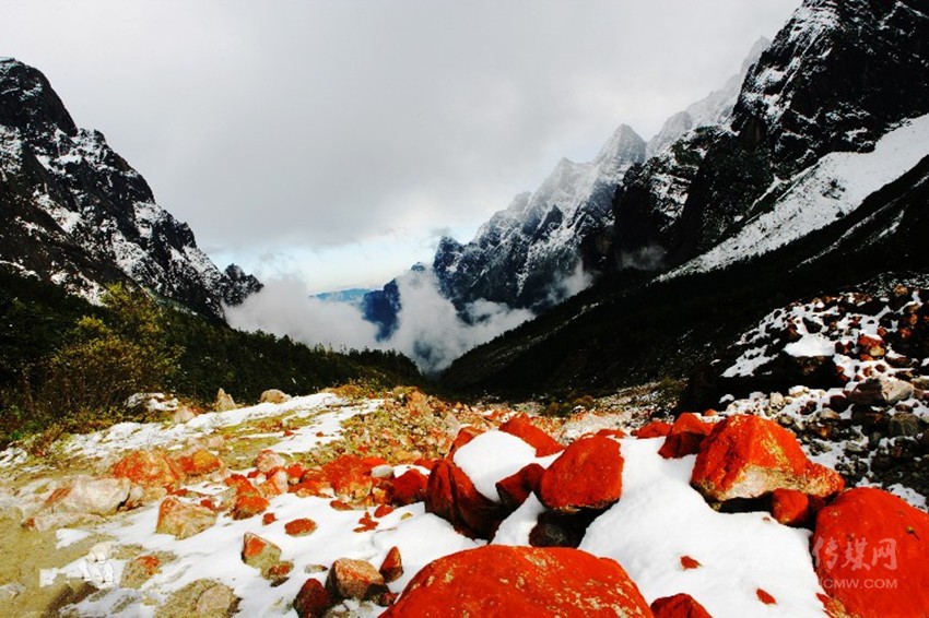 燕子溝最精華的景觀(guān)是紅石灘,此處為亞洲最大的紅石灘。石頭上布滿(mǎn)的紅色物質(zhì),是一種微生物,在高山特有的生態(tài)環(huán)境內(nèi)得以繁衍,構(gòu)成生命與歷史相融共存的奇特景觀(guān)。因?yàn)樯碁├锏氖^都長(zhǎng)了一層紅色的苔蘚,就好象沙灘里的石頭都穿上了喜慶的紅衣,使得燕子溝成了顏色的世界。據(jù)說(shuō)只有在空氣質(zhì)量很好的情況下,這種苔蘚才能夠生存,曾經(jīng)有研究院的科學(xué)家為將這種石頭帶出去研究,結(jié)果剛下飛機(jī),發(fā)現(xiàn)石頭上的紅色退了,因?yàn)榭諝赓|(zhì)量不好,導(dǎo)致石頭上的苔蘚無(wú)法生存。