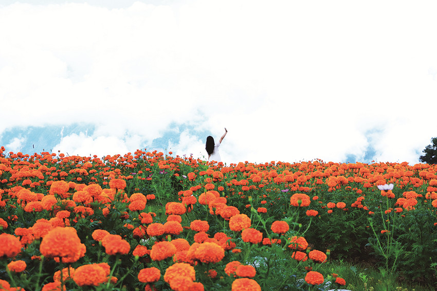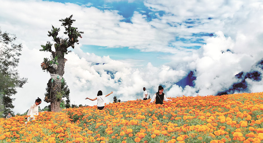 在這金風送爽的秋日,瀘定德威加郡海子村18萬株萬壽菊競相綻放,漫步在花海之中,人們可以感受秋風的輕撫,呼吸清新的空氣,寧靜的村寨依托著貢嘎雪山、藍天白云,在成片的萬壽菊裝點下構(gòu)成了一幅亮麗的鄉(xiāng)村畫卷。