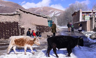8、甘孜縣城郊雪山下的也哈村,雪后初睛,村民們?cè)趬菚裉?yáng),生活悠然而恬靜。