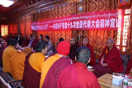 宣講團成員勇勇用藏語激情洋溢的宣講黨的十九大精神,現(xiàn)場不斷響起熱烈的掌聲。當勇勇講到我國五年來取得的輝煌成就時,僧人們都激動不已,紛紛為發(fā)展成就點贊。“聽了今天的宣講,我進一步了解到了我們國家這些年來取得的發(fā)展成就。一直以來,黨對我們的關(guān)懷是看得見摸得著的,現(xiàn)在我們的寺廟管理越來越規(guī)范,基礎設施也得到了完善,通往寺廟的道路也有了明顯改善,我們的生活越來越好了,這一切都是共產(chǎn)黨的功勞。”寺廟僧人尺乃表達著對黨的感恩。
