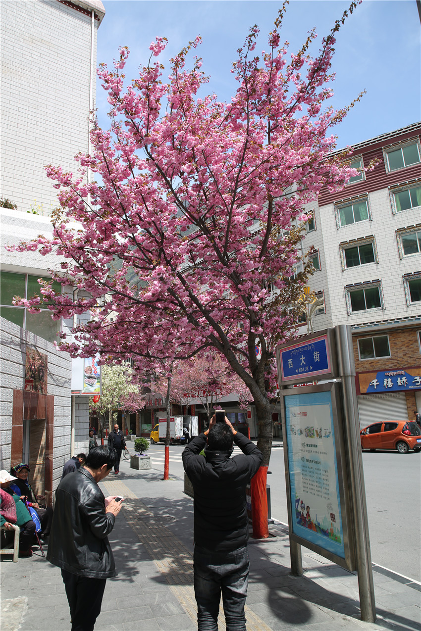 當(dāng)春天遇見最美的櫻花時(shí),驚艷了整個(gè)康定。櫻花與身邊人都將成為春日里的浪漫風(fēng)景。櫻花之美,美在氣勢,櫻花紛飛,夢幻唯美。每年4月中旬,康定城北門的櫻花綻放后,人們像是約好了一樣聚集到這里,共赴這一場甜美盛宴。這一路繁花似錦,人們穿過枝椏花正盛的櫻花林,穿過粉色海洋,徑直奔向一個(gè)浪漫的童話,一路櫻花飄散,一路粉光燦爛。櫻花絢麗繽紛、陸續(xù)綻放,若恰逢一陣春風(fēng)經(jīng)過,櫻花瓣隨風(fēng)舞動(dòng),猶如紛落的雪花,空氣中浮動(dòng)著櫻花特有的淡淡香氣,令人不禁懷疑自己置身夢境?!翱刀ǖ拇禾靵淼靡硪恍?,綻放的櫻花,滿街的花草,折多河畔楊柳依依,康定的春天無比驚艷,醉了游人?!敝芟壬贿吪恼眨贿吀袊@,他在康定生活了40多年,20年前的康定,可以說找不到像樣的花草樹木,進(jìn)入新時(shí)代,康定城市變美了,城市綠化走在了前面,城市的美譽(yù)度舒適度不斷提升??刀ㄖ海荷珴M園,姹紫嫣紅,風(fēng)光旖旎。