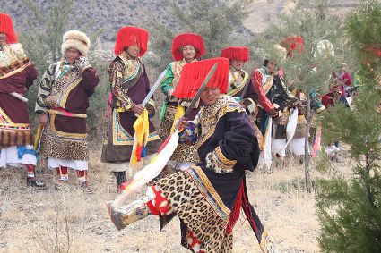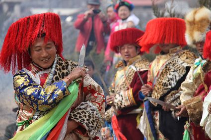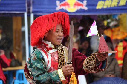 除了歌舞文化,德欽還是民俗文化最大的平臺(tái),神山祭祀是村村寨寨必不可少的活動(dòng),在德欽,藏民對(duì)山水自然賦予了靈性,認(rèn)為自然也是和人一樣有著生命和靈性,尊重自然演繹出神山祭祀活動(dòng)豐富多彩?!暗顿潯?藏語(yǔ)稱“百諧”。在德欽農(nóng)村,刀贊是祭祀活動(dòng)的重頭戲,這一天,不亞于一個(gè)盛大的服飾表演。相傳“百諧”是古時(shí)村民為消除戰(zhàn)亂,祈福平安的一項(xiàng)傳統(tǒng)祭祀活動(dòng),延續(xù)至今已經(jīng)成為一項(xiàng)傳統(tǒng)的民俗活動(dòng)?!鞍僦C”既是祭祀活動(dòng)的一個(gè)儀式,也是一個(gè)獨(dú)立的傳統(tǒng)民俗活動(dòng),村里每戶一男丁在這一天必須參加“百諧”。“蘇夏”是村里男人戴的最為隆重的帽子,他不同于金邊帽和狐皮帽。長(zhǎng)刀是“刀贊”的道具, “吉祥的日子里,我們一敬天地,賜給我們帶來(lái)幸福的生活;再敬尊敬的共產(chǎn)黨,為我們帶來(lái)平安吉祥;三敬慈祥的雙親,教會(huì)我們?nèi)绾巫鲆粋€(gè)好人……”朗朗上口的說(shuō)詞伴著閃閃的刀光起舞,頗具康巴壯士的英武陽(yáng)剛。