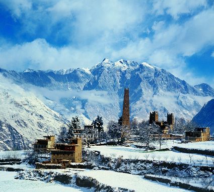 白雪皚皚,窗明幾凈,陽(yáng)光從高山傾瀉而出。丹巴正沐浴著冬日的陽(yáng)光,一幢幢外形美觀,風(fēng)格統(tǒng)一的寨房依著起伏的山勢(shì)迤儷而建,高高低低,錯(cuò)落有致,與周?chē)宄旱南?,皚皚的雪峰,構(gòu)成一幅田園牧歌式的優(yōu)美的鄉(xiāng)村畫(huà)卷。