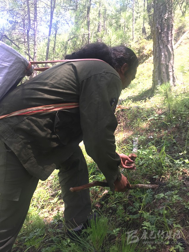 披著夜色,記者和康扒珠徑直向基俄山頂走去,要找到最好的松茸,就要走最遠的路。約莫走了近一個半小時的路,記者和他已經(jīng)來到基俄山的半山腰,康扒珠貓著腰尋找起來。第一次參與采摘松茸的記者十分興奮。很快康扒珠已經(jīng)發(fā)現(xiàn)了第一朵松茸??蛋侵橛檬种械哪竟鬏p輕地將松茸挑起來,握在手中仔細打量,他告訴記者:“這顆松茸個頭挺大,但是還不是精品,開傘了,只能算是三等品。”說罷他又繼續(xù)尋找松茸。過了一個多小時,他的背簍里也才有十幾朵松茸。